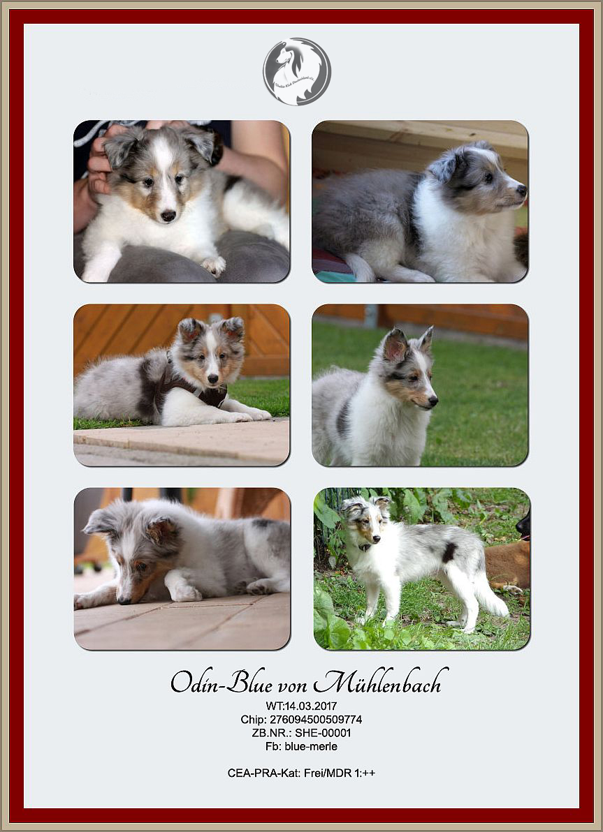 Hallo, ich heiße Odin-Blue von Mühlenbach, ich bin ein Shetland Sheepdog, auch bekannt ist als Sheltie, ich wurde am 14. März 2017 geboren, meine Züchter sind die Familie Schiffer. Ich war auch nicht allein, denn ich habe auch noch drei Geschwister. Das erste Mal wurde ich von mir unbekannten Menschen am 30 April 2017 besucht. Die haben mich fast tot geknuddelt, aber ich fand es toll. Wie sich einige Zeit später heraus stellte, sollte das meine neue Familie werden, was ich zu diesem Zeitpunkt noch nicht ahnen konnte. Am 20. Mai war es dann soweit, daß ich mein neues Zuhause bezogen habe. Meine Geschwister waren auch schon weg, das fand ich gar nicht lustig. Eine lange Autofahrt stand noch an. Hätte ich das geahnt, wäre ich bestimmt nicht mitgegangen. Ich wurde in eine Box im Auto gebracht. Man war das blöd, ich war allein und mir war nicht ganz geheuer, denn was sollte jetzt passieren. Da war ich so ganz allein und dann auch noch eine Umgebung die ich überhaupt nicht kannte. Da waren so viele neue Gerüche und Eindrücke, die ich gar nicht einordnen konnte. Nachdem wir dann am Ziel angekommen waren, kam da auch noch ein mir unbekannter großer Hund auf mich zu. Als ob das noch nicht reichte, habe ich gleich am ersten Tag im neuen Heim auch noch die Bekanntschaft mit Wasser gemacht. Sie nannten es Pool. Toll, warum hat mich keiner gewarnt? Ich kann euch sagen, das war naß, kalt und auch nicht schön. Ich wurde aber sehr schnell "gerettet" und auch sofort wieder trocken gerubbelt. So fing der erste Tag im neuen Zuhause an. Nachdem der Tag für mich sehr lang und aufregend war, sollte es nun an der Zeit sein, sich zur Ruhe zu begeben. Ich hatte gut gefuttert und das war auch lecker. Danach habe ich mich wie immer ausgeruht. Meine neuen Menschen hatten da so einen Käfig, so habe ich es gesehen und da war ein tolles weiches Bett drin. So etwas kannte ich noch nicht, aber es war schön weich. So legte ich mich zur Ruhe und habe erst mal geschlafen. Das war toll und nachdem ich wach wurde ging es nach draußen, was ich da sollte wußte ich nicht, aber da ich nun mal draußen war, nutze ich die Gelegenheit und erleichterte mich. Zu Hause war das anders, aber was sollte ich machen, ich mußte und so hatte ich auch keine andere Möglichkeit. Mir ging es danach auch viel besser. Was ich ganz komisch fand, war, daß sie immer so etwas wie Odin gesagt hatten. Was meinten die damit nur? Kam mir zu dem Zeitpunkt schon komisch vor, aber es stellte sich später raus, daß jedes Mal, wenn sie das sagten und ich habe darauf reagiert, ich was Tolles von ihnen bekam. So dachte ich mir, warum nicht, wenn die Odin sagen und ich komme, dann gibt es was Leckeres. Also beschloß ich, wenn ich das hörte, lauf mal hin, da gibt es was Schönes. Wäre doch schön dumm, wenn ich mir das entgehen lassen würde. So nun zu meiner Nachtruhe. Ich hatte doch schon die komische Box erwähnt. Diese sollte nun wieder ins Spiel kommen. Ich bekam wieder mal was Leckeres und wurde so in die Box gelockt. Da ich einen langen Tag hatte, der sehr aufregend war und auch noch ein wenig Hunger, folgte ich dem Leckerchen und schups, war schon wieder in der Box. Dann wurde es dunkel und ich merkte das es still wurde, mir war das schon unheimlich. Unbekannte Gerüche, neue Menschen und dunkel. Ich beschloss darüber nachzudenken und so im Gedanken daran, bin ich doch glatt eingeschlafen. Das war mein Tag der Abholung und des neuen zu Hauses was ich ab jetzt Mein nennen durfte. Seht euch die Bilder an und ihr könnt miterleben, wie es weiter ging. Es wird noch Weiteres von mir folgen. Bin gerade erst dabei alles auszusuchen.